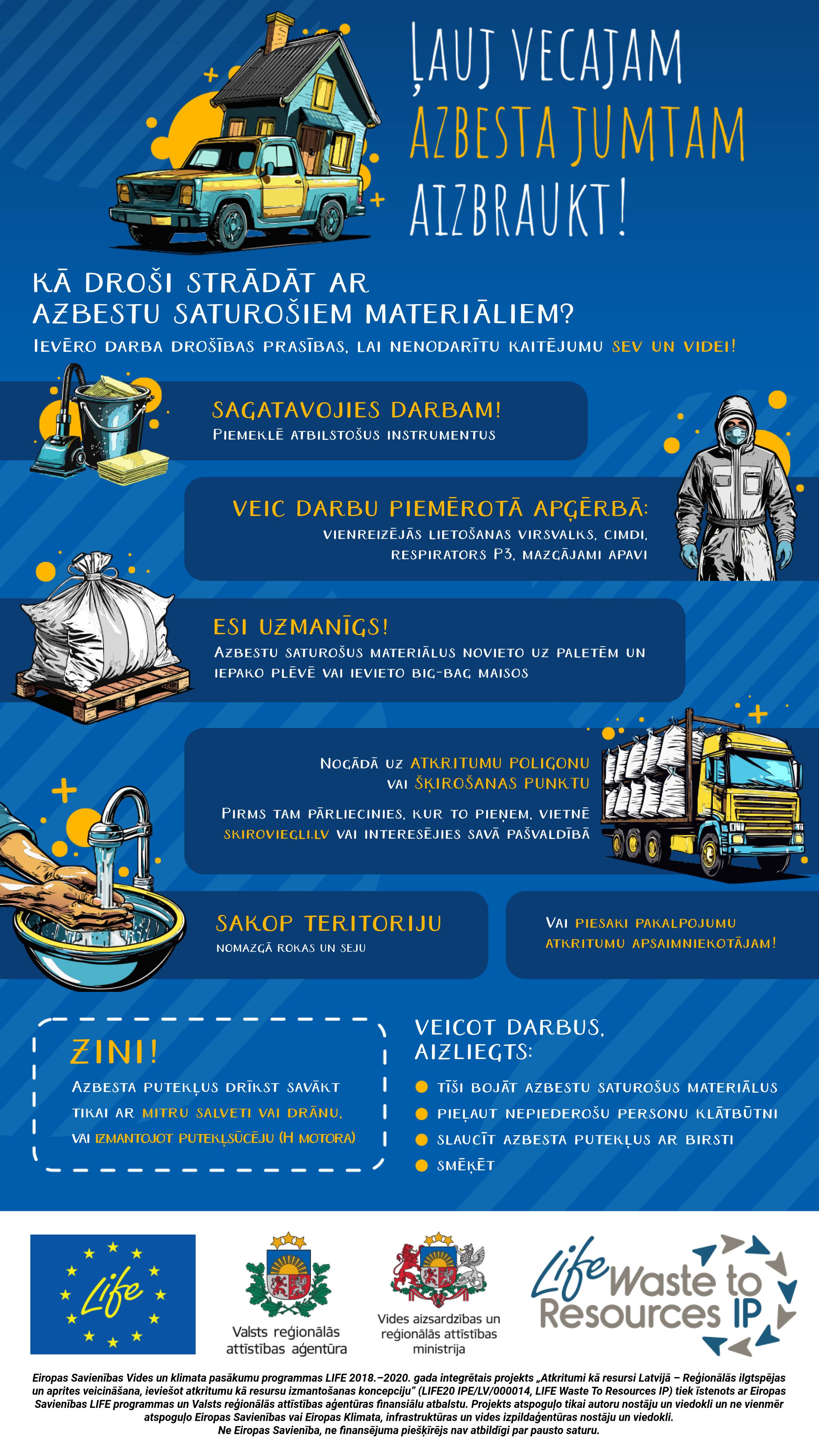 Azbestu saturoši būvniecības materiāli pēc to kalpošanas laika ir bīstami atkritumi – tie būtiski kaitē videi, piesārņojot gaisu, augsni un gruntsūdeņus, un ir jānodod apglabāšanai tikai atkritumu apsaimniekošanas poligonos. VARAM īstenotās kampaņas “Ļauj vecajam azbesta jumtam aizbraukt!” ietvaros trūcīgām un maznodrošinātām mājsaimniecībām ir iespēja atbrīvoties no azbestu saturoša šīfera krājumiem bez maksas.