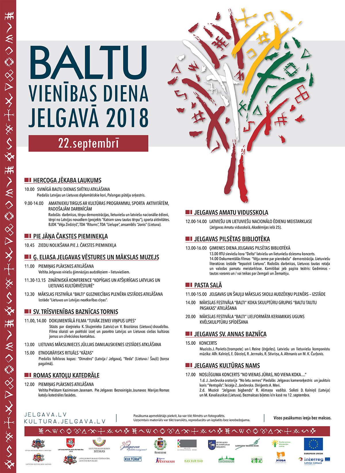 Projekta partneri, Jelgavas iedzīvotāji, pilsētas viesi un citi interesenti aicināti apmeklēt zinātnisko konferenci “Kopīgais un atšķirīgais Latvijas un Lietuvas kultūrvēsturē”, kas pulksten 11 notiks Ģ. Eliasa Jelgavas Vēstures un mākslas muzejā. Konferencē abu kaimiņvalstu lektori aplūkos tādas tēmas kā “Latviešu un lietuviešu atšķirīgais ceļš uz valstiskumu: vēsturiskā pieredze un izaicinājumi”, “Latviešu un lietuviešu valoda: kopīgais un atšķirīgais”, “Baltu uzkalniņu kultūra (1.-4.gs.). Austrumbaltija un Lielupes baseins” un “Latviešu un lietuviešu tautastērpi: kopīgais un atšķirīgais”. Vēl pie muzeja vēsturiskās ēkas notiks piemiņas plāksnes, kas veltīta Jelgavas vīriešu ģimnāzijas audzēkņiem - lietuviešiem, kuri 1918. gada 16. februārī parakstīja Lietuvas Neatkarības aktu, svinīga atklāšana.