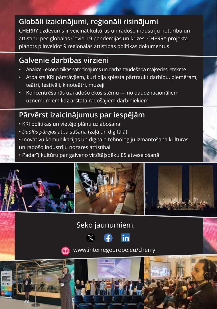Projekta mērķis: pilnveidot reģionālās attīstības politikas dokumentus projektā iesaistītajos partnervalstu reģionos, stimulēt radošā sektora atgūšanos pēc Covid-19 krīzes, kā arī veicināt kultūras un radošo industriju attīstību reģionā, sekmējot ekonomikas attīstību un ES konkurētspējas palielināšanos.